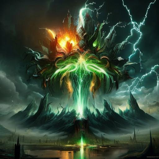 ((masterpiece)), ((best quality)), ((fantasy)), ((concept art)),((randomdarkstyle)), solo focus, CHSNGN, destroyed, explosion, lightning, burning, masterpiece, awesome quality, hyper detailed, A digital painting, DonM3lv3s, advntr.