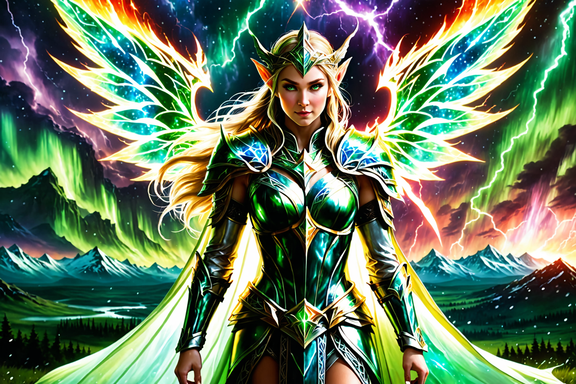 sexy ((shimmering with prismatic colors across the entire body, each hue pulsing with battle energy):2.0), ((aurora battle armor encasing the whole body, glowing with northern light hues, reinforced for endgame combat):1.8), ((wide shot with a storm phoenix soaring above the battlefield, wings crackling with lightning and fire, full form dominating the sky):1.7), ((wide shot of a vast tundra where prismatic ice reflects a war-torn sky, elven legions clashing in frozen chaos across the horizon, wide shot with auroras clashing in the sky, vibrant light battling darkness over the sprawling combat zone):2.2), ((wide shot of commanding elven forces in a massive battle across a war-torn landscape, light and shadow bending to will, armies clashing in epic scale, with an epic and heroic intensity, battle royale climax across the vast scene):1.9), ((real photo of a storm crown, crackling with lightning and elven might, worn in a vast battle scene):1.5), ((wide shot of a storm surge electrifying the vast combat zone, lightning and wind clashing):1.6), ((aerial photo shot, expansive view of elven battle chaos stretching to the horizon, real photo perspective, cosmic palette with starry gradients and void hues, battle royale grandeur in a wide view, starlight illumination, twinkling amidst the sprawling battlefieldâs fury):1.8), <lora:DonM3lv3sXL-000005:1>