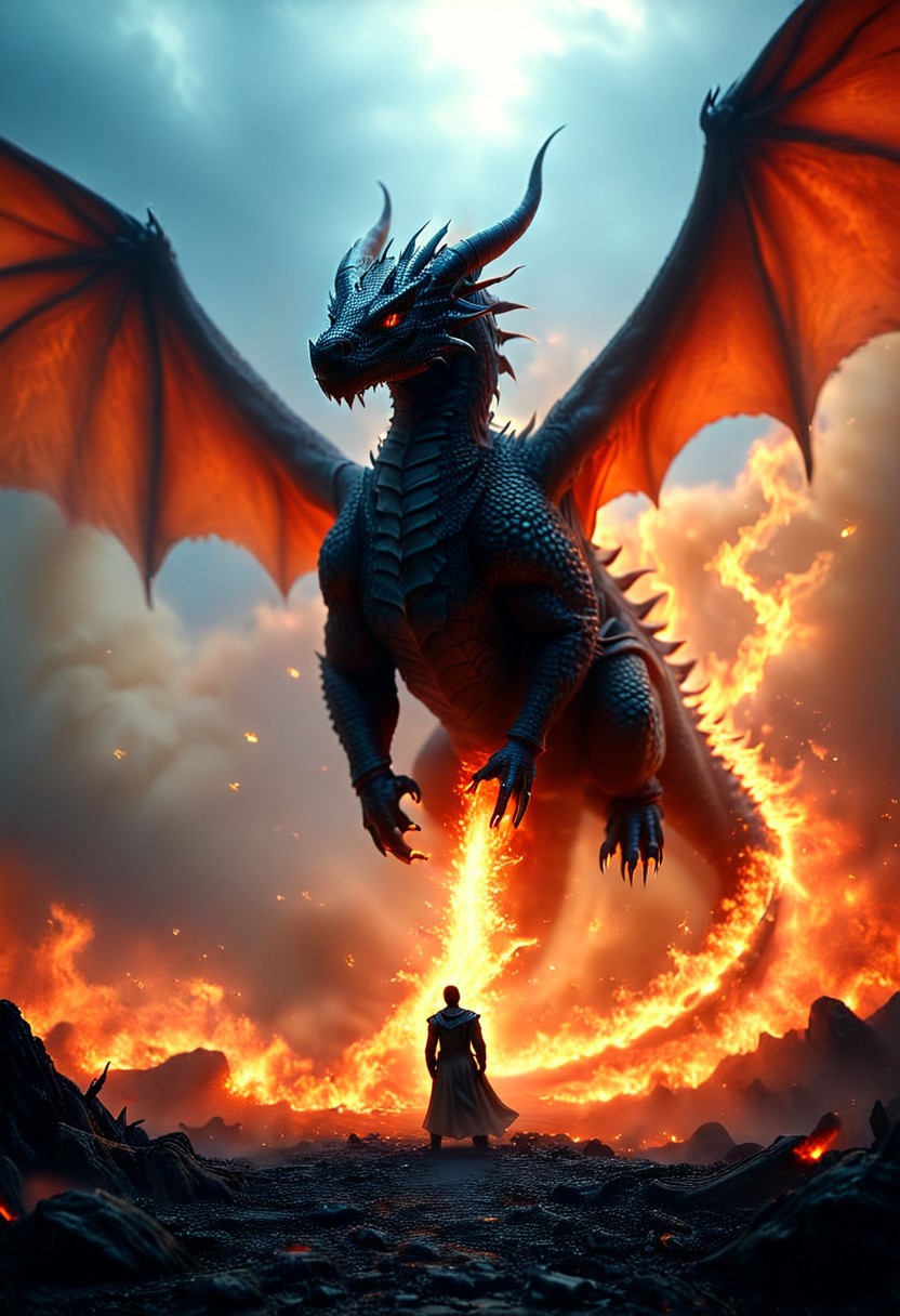 Digital fantasy artwork depicting a dramatic scene with a large dragon dominating the upper half of the image. The dragon is shown in a dynamic pose, with its wings spread wide and its mouth open, releasing a stream of fire towards the ground. The creature's scales are dark and textured, blending into the stormy, cloud-filled sky. Below, a small silhouetted figure stands amidst the fiery explosion, adding a sense of scale and intensity to the scene. The landscape is barren and dark, with sparse, charred trees scattered across the foreground. The color palette is dominated by fiery oranges and deep grays, creating a contrast between the dragon's fire and the ominous sky. The overall composition conveys a sense of power and impending doom. <lora:FluxMythP0rtr4itStyle:0.6> <lora:flux.1_lora_flyway_Epic-Characters_v1:0.6> <lora:Elden_Ring_-_Yoshitaka_Amano:0.33>