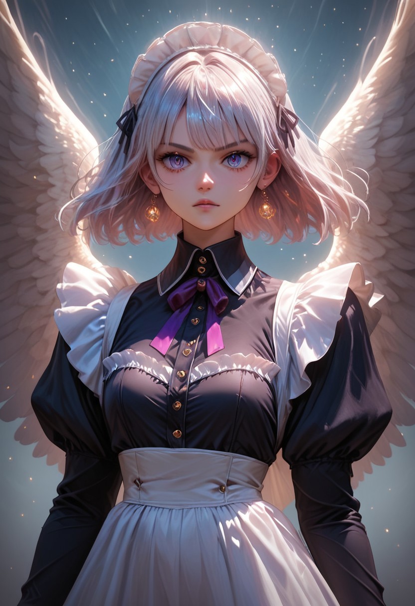 rating_safe, lazyup, AngelicStyle, score_9, score_8_up, score_7_up, style, high quality, best quality, best artist, CivChan, powerful expression, maid's outfit over a black bodysuit, massive intricate feathered wings attached to back, gilded with gold, silver-white hair flowing in the wind, ethereal light, dreamy twilight sky, dynamic pose, mid-air leap, anatomically correct wing placement, 3/4 view, high detail, fantasy art, digital painting, movement blur