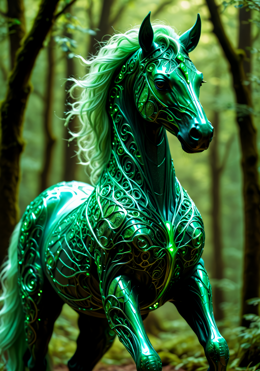 masterpiece, extremely detailed, sharp outlines, high contrast, fine details, intricate, fantasy, female centaur, pointed ears,half horse, forest palace, green theme, energy particles, glowing green, translucent green skin, SFW, glowing inner body, translucent,, DonM3lv3s, BioMetallicBeauties<lora:challenge\SD1.5\DonM3lv3s-000008.safetensors:0.8000000000000002:0.8000000000000002> <lora:Pony\BioMetallicBeauties.safetensors:0.8000000000000002:0.8000000000000002>