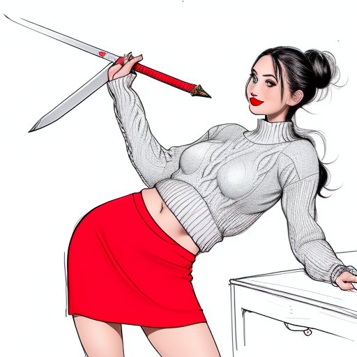 yuri, medium hair, hair over shoulder, sweater, fellatio, on back, condom, sketch, reverse cowgirl position, sword, red lips, indian style, oral, hair bun, skirt lift, pencil skirt, sportswear, smile