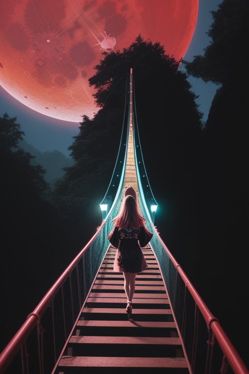 mega beautiful neon butterfly suspension bridge on the night cliff, beautiful girl walking on the bridge, rich colors, play of colors, fairy tale landscape, red moon, stardust, rainbow, macro, detail drawing, realistic, intricate details, hyper-detailed, kodak 50mm lens, professional photoshoot, full-hight scene view, intricate details, vivid colors, 50mm lens, octane rendering, professional photoshoot