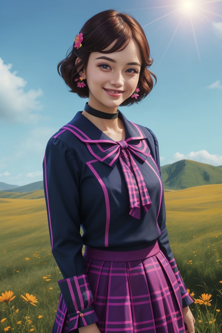 masterpiece, best quality, high quality, (sfw), vivid, full color, ciTron Legacy, 1girl, hair ornaments, kawaii, flowers, gorgeous accessories, sailor collar and plaid skirt, aesthetic, rainbow colors, happy, smile, looking at viewer, makeup, outdoors, grasslands, glow, sky, sunlight,