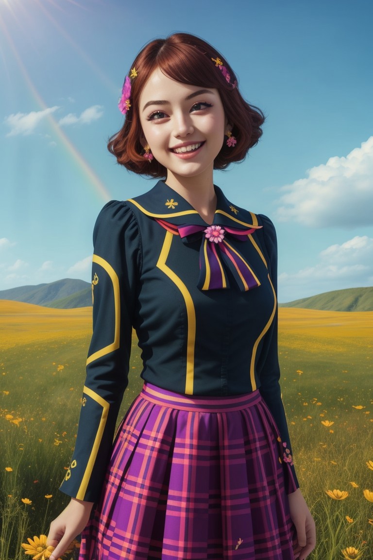 masterpiece, best quality, high quality, (sfw), vivid, full color, ciTron Legacy, 1girl, hair ornaments, kawaii, flowers, gorgeous accessories, sailor collar and plaid skirt, aesthetic, rainbow colors, happy, laughing, looking at viewer, makeup, outdoors, grasslands, glow, sky, sunlight,