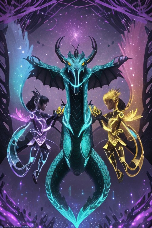 Create a captivating scene of three tiny fractal dragons made of shimmering diamond-like dust.** Each dragon glows ethereally in shades of lilac, green, gold, blue, and pink, their bodies trailing vibrant threads and sparkling elements. Set against a magical forest, illuminated by starlight, the dragons flutter gracefully through the air, leaving a trail of glitter behind. The camera slowly pans through the forest, capturing the twinkling lights and the intricate details of the dragons, accentuating the fantasy atmosphere.