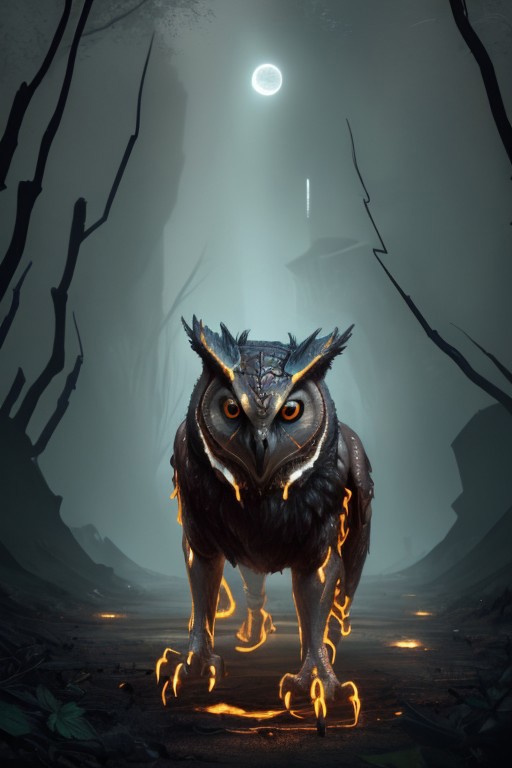 In a dark forest, iron toy animals emerge, gleaming under faint moonlight. A rusty owl perches atop a gnarled branch, its eyes glimmering amber. Below, a metallic fox crouches, textured with intricate gears, while a lion roams silently, reflecting shadows. The camera pans slowly, capturing the eerie stillness as leaves rustle softly, the scene encapsulating a surreal, dreamlike ambiance.