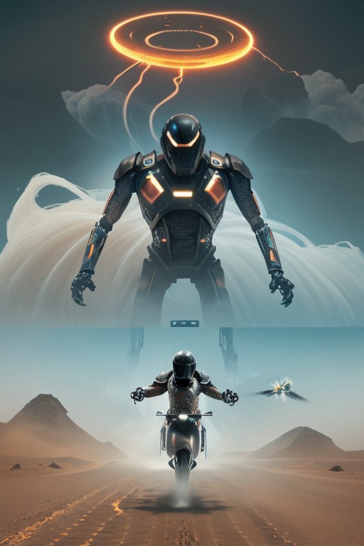 A bionic cybernetic monster battles in an emerald-gloss city, featuring a white scorpion with a curved, stinger-tailed body raising its claws. A warrior in cosmic armor, with a spear and hood, rides it through a sandstorm, clouds of smoke swirling around. As the desert winds whip through the white sands, rolling tumbleweeds dance in the background, revealing a flying castle in a blurred world of exoplanetary wonders above.