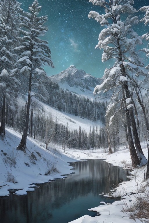 Masterpiece, high-resolution, grainy image, tall mountains, pine forest, lake, snow, galaxy