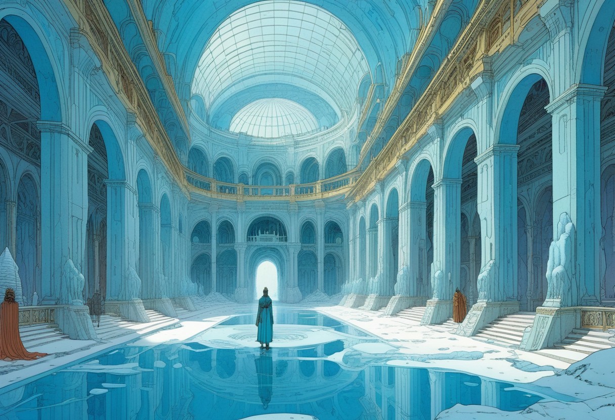 Landscape, Moebius (Jean Giraud) Style page, inside palace, ice, huge palace, indoors, blue