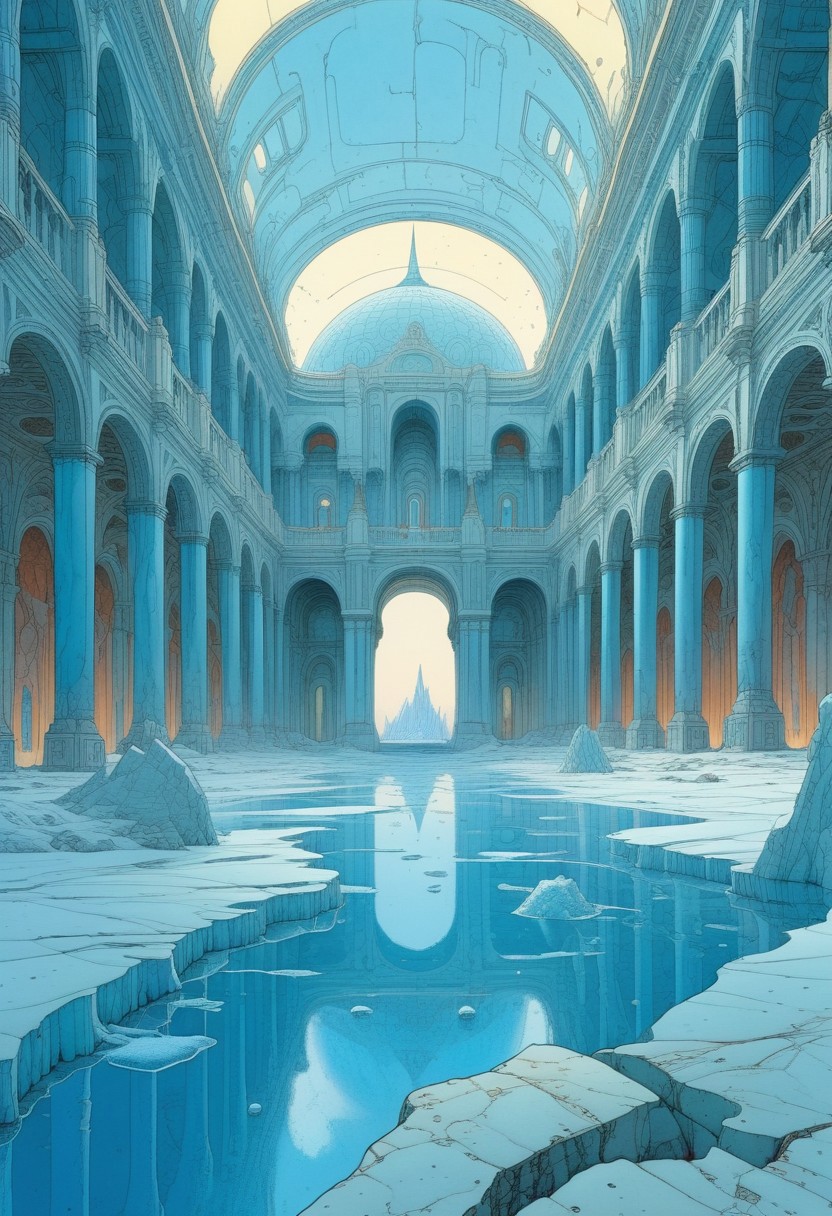 Landscape, Moebius (Jean Giraud) Style page, inside palace, ice, huge palace, indoors, blue, barren, no life