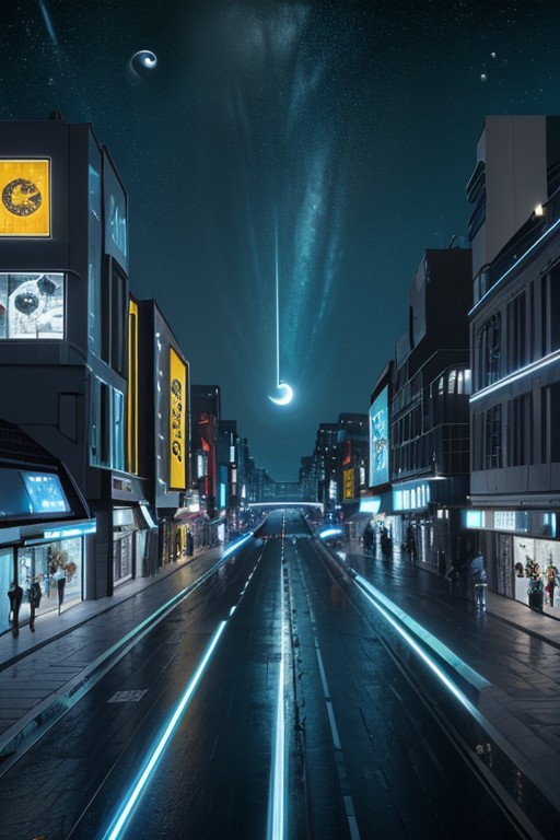 ((masterpiece,best quality)), absurdres, <lora:CiTron_Legacy:0.8>, citron legacy, (city, buildings with windows:1.2), blue glow, blue theme, moon, starry sky, space, neon signs, vehicles, nighttime,
