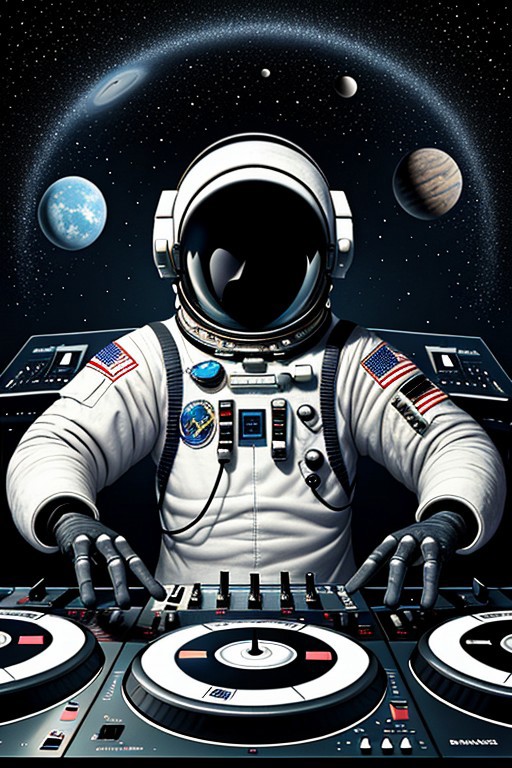 This is a stylized black and white illustration of an astronaut in space. The astronaut is wearing a spacesuit with a helmet, which has reflective visors showing the stars. The suit includes intricate details such as gloves, communication devices on the shoulders, and a camera attached to the chest. In front of the astronaut are two DJ turntables and a mixer. The astronaut's hands appear to be operating the equipment, suggesting that they are engaged in some form of music mixing or DJing. This creates a unique blend of space exploration and musical creativity within the same visual theme. The background features a starry sky, enhancing the cosmic atmosphere. The overall design combines elements from science fiction and modern culture, creating an imaginative scene where the boundaries between different realms are creatively merged.