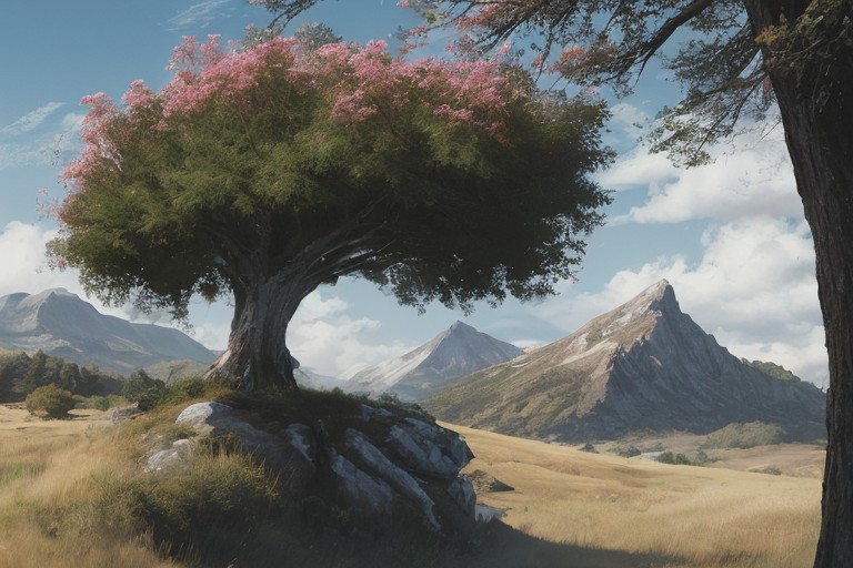 scifi scenery, outdoors, scenery, tree, flower, sky, day, nature, mountain, grass, blue sky, string of flags, landscape, field, fantasy, forest, cloud, 1girl, photorealistic <lora:XL-futurism-extraordinaire:1>
