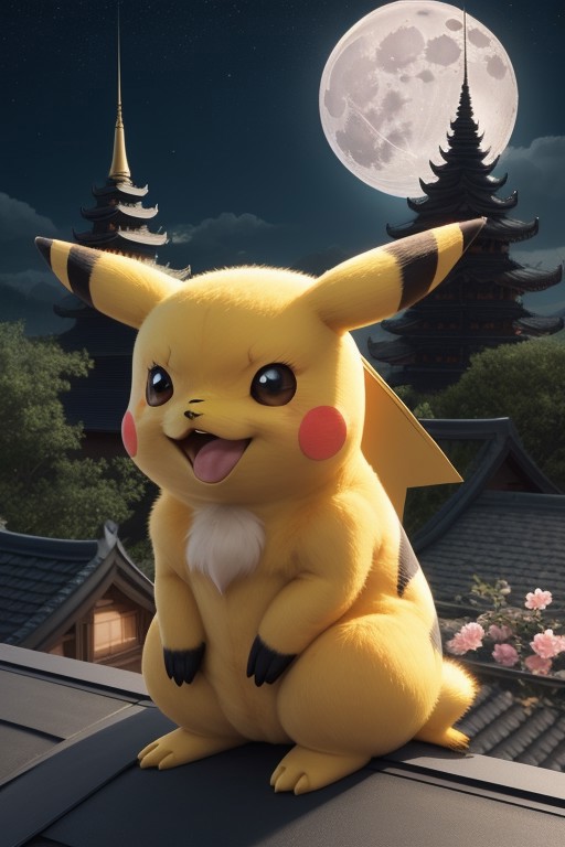 Pikachu, fluffy fur, solo, black_eyes, flower, outdoors, sky, cloud, tree, no_humans, animal, facial_mark, Pokémon, night_sky, full_moon, starry_sky, Pokémon focus, architecture, east_asian_architecture, whiskers, yellow_fur, huge_moon, from straight-on, cute Pikachu sitting on a rooftop under a large full moon, surrounded by a fantasy setting with tall pagodas and flowers. Pikachu is sitting, looking at the viewer with large, expressive black eyes. the Pokémon has yellow fur with black stripes, and its ears are perked up, giving it a curious expression.