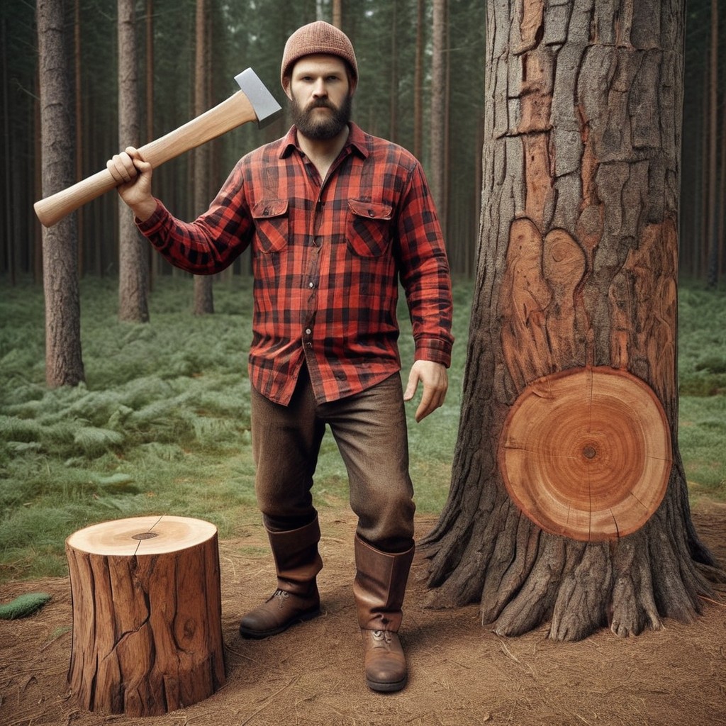 imagine, A lumberjack wearing clothes made of wood cuts a tree trunk with a wooden-edged axe.