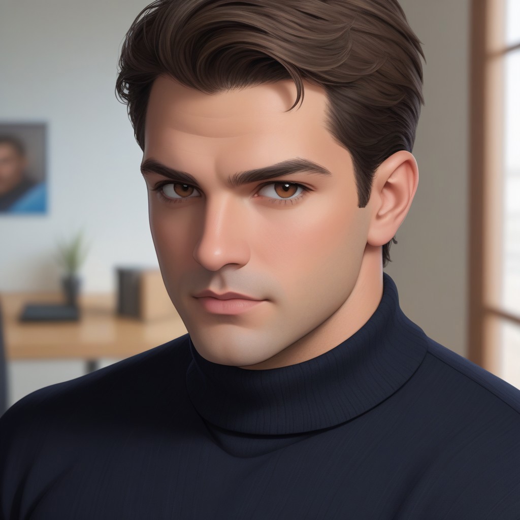 Portrait of \( Juan Carlos Bahamón Chaad \) casually standing Bahamón in an architecture office with bluepriets in the walls: solo, 1boy, male focus, adult, age:39, 5'11", 180 lbs, sand skin, rectangular face, short hair, brown hair, straight hair, brown eyes, short eyebrows, roman nose, (clean-shaven, shaven, shaved, smooth face), wristwatch, black turtleneck sweater, confident stance, indoors, (close-up:1.4), realistic, masterpiece, correct anatomy, sharp focus, field of view