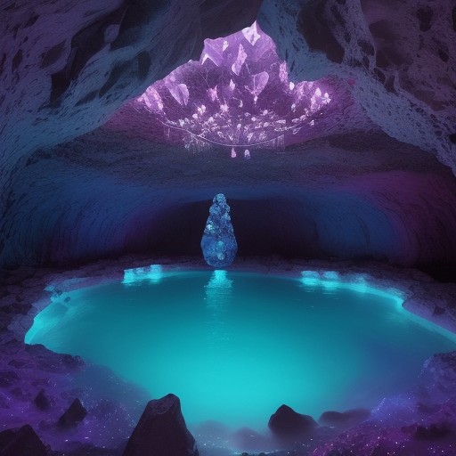 A breathtaking underground cavern filled with massive, glowing crystals in shades of blue, purple, and pink. A pool of clear water reflects the shimmering lights.