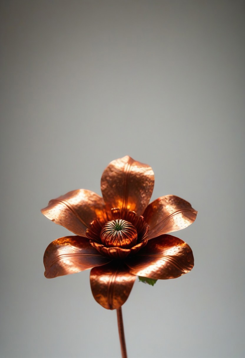 A flower, copper flower, simple background, indoors, wonderful, interesting, made of copper,