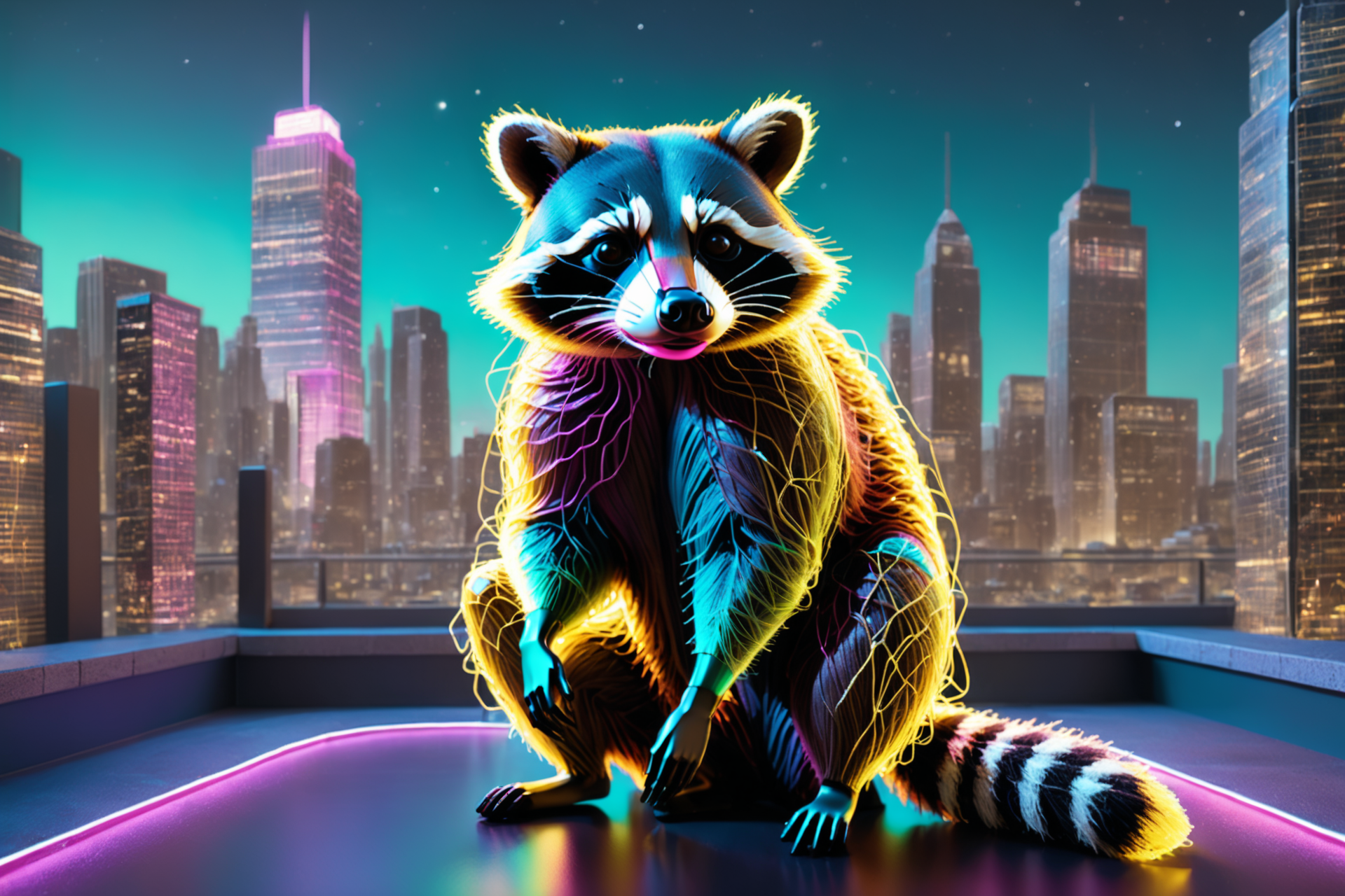 ((fantastic neon raccoon with filament mask, <lora:World_of_Glass_Filament:1>, made of, tiny neon glass filaments, w0gf1l, solo):2.5), ((calm gaze, filaments softly pulsing):2.0), ((antlers made of tiny neon glass filaments):1.8), ((futuristic cityscape with glowing filament threads hanging from skyscrapers, starry sky, detailed background):2.2), ((spinning with cyber claws, dynamic spin, excited scamper, filaments glowing, character focus, close-up shot):1.9), ((bone made of tiny neon glass filaments):1.5), ((best quality, vibrant colors, realistic style, soft light, soft light, close-up shot):1.8)
