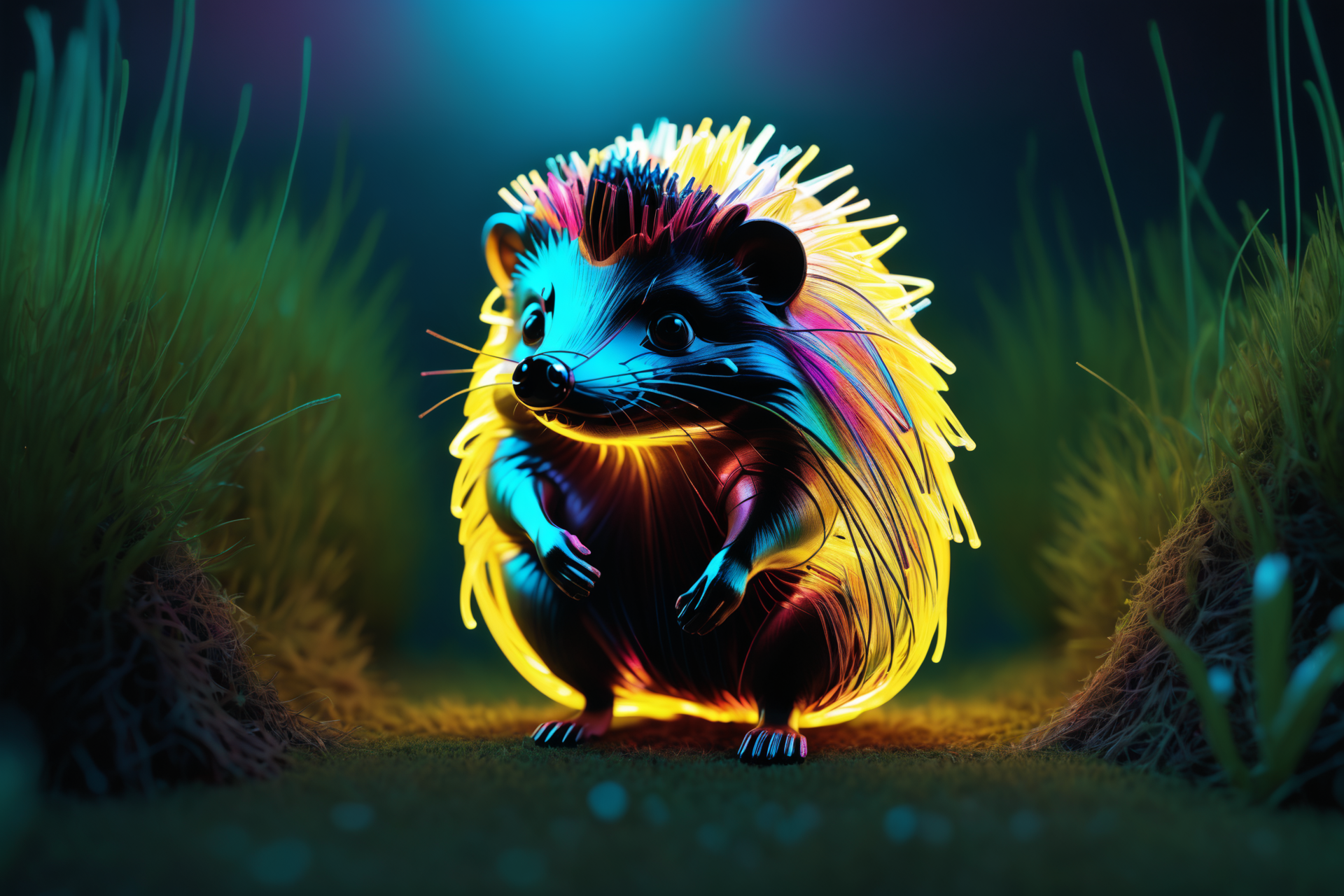 ((luminous light hedgehog with filament spines, <lora:World_of_Glass_Filament:1>, made of, tiny neon glass filaments, w0gf1l, solo):2.5), ((alert stance, filaments vibrating):2.0), ((stripes made of tiny neon glass filaments):1.8), ((futuristic meadow with filament threads in grass, glowing flowers, starry sky, detailed background):2.2), ((sitting, holding a cyber lantern, facing forward, prancing happily, filaments dancing, environment focus, wide shot):1.9), ((best quality, vibrant colors, realistic style, soft light, mixed rainbow colors, dynamic angle, wide shot):1.8)