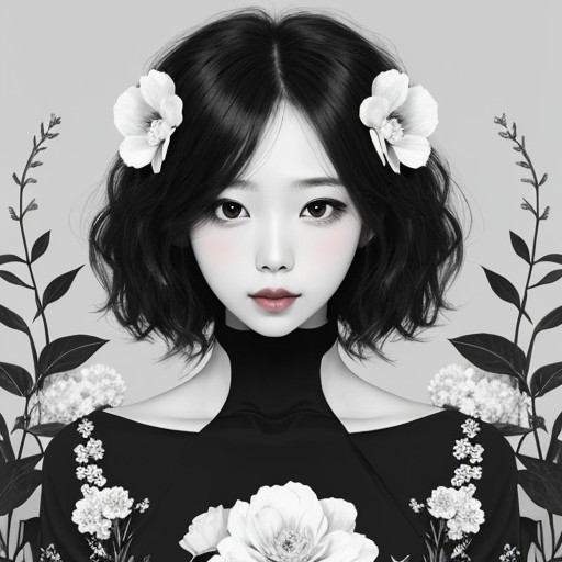 (ttatt:1.1), a girl with half face on flowers, dark style, bw, chrome, masterpiece, dynamic forms