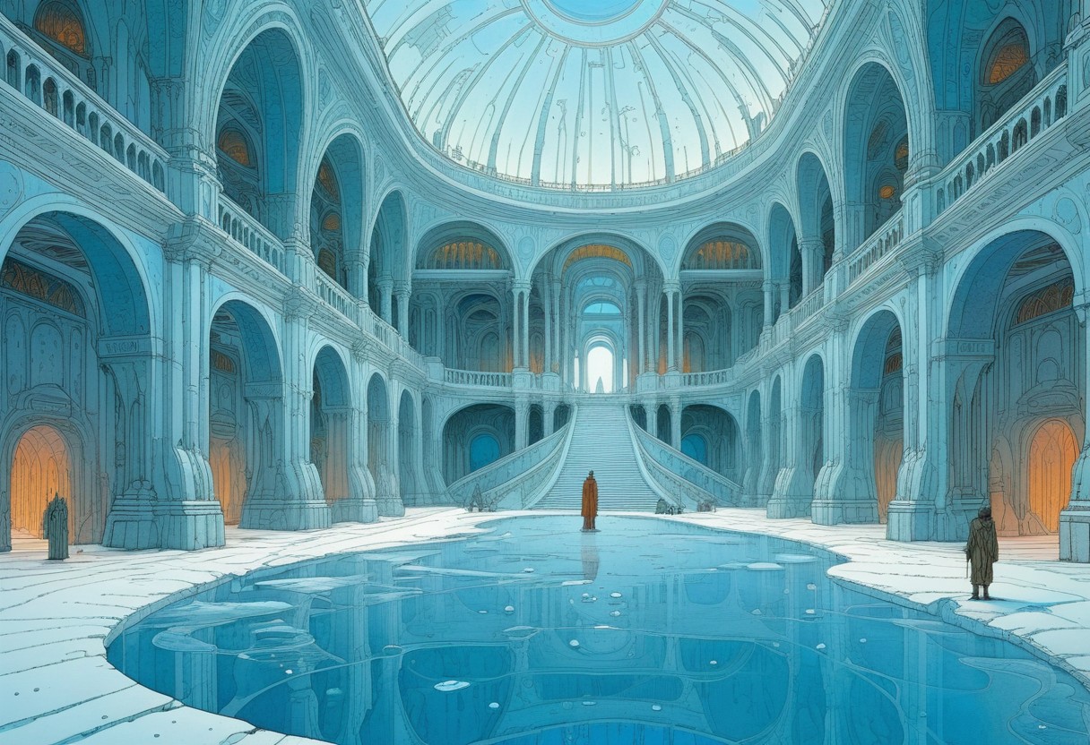 Landscape, Moebius (Jean Giraud) Style page, inside palace, ice, huge palace, indoors, blue