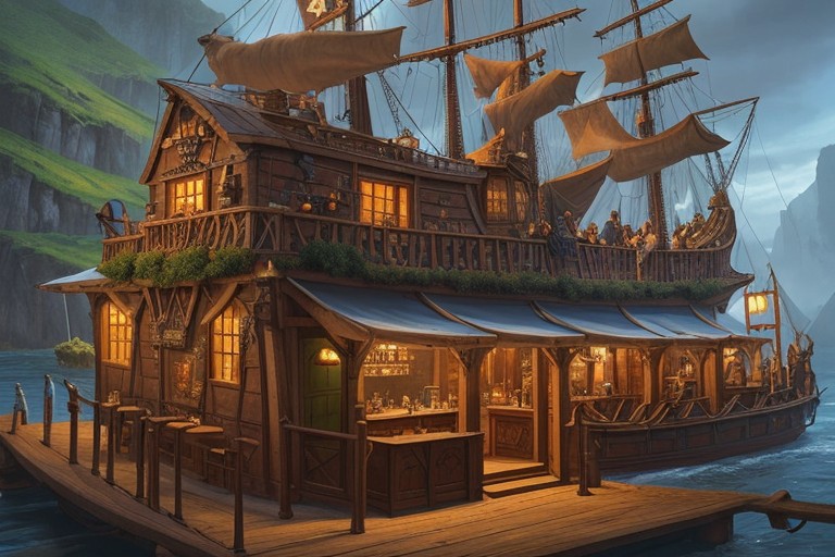 fantasy scenery, medieval tavern built into a pirate ship, outdoors, wide shot,