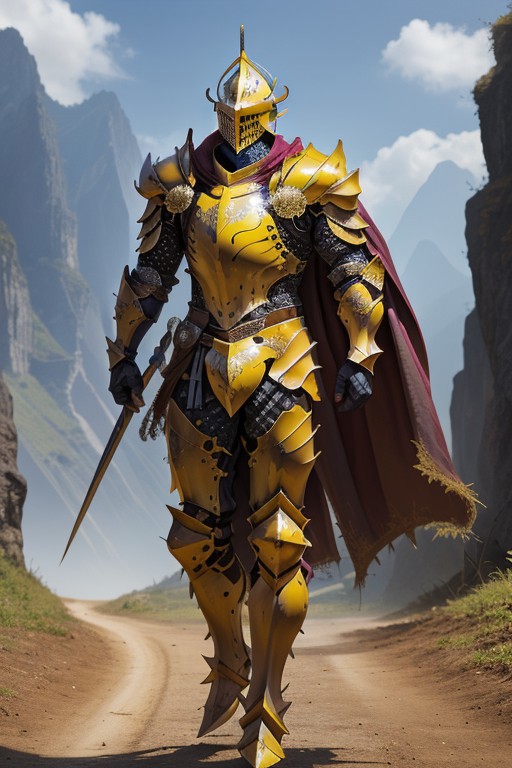 1boy, solo, solo focus, teenage, wear medium armor, amber color armor theme, spiked helmet, outdoor, cape, beautiful scenery in the background, fantasy style, knight, armor, helmet, body straight to viewer, front body view, full body