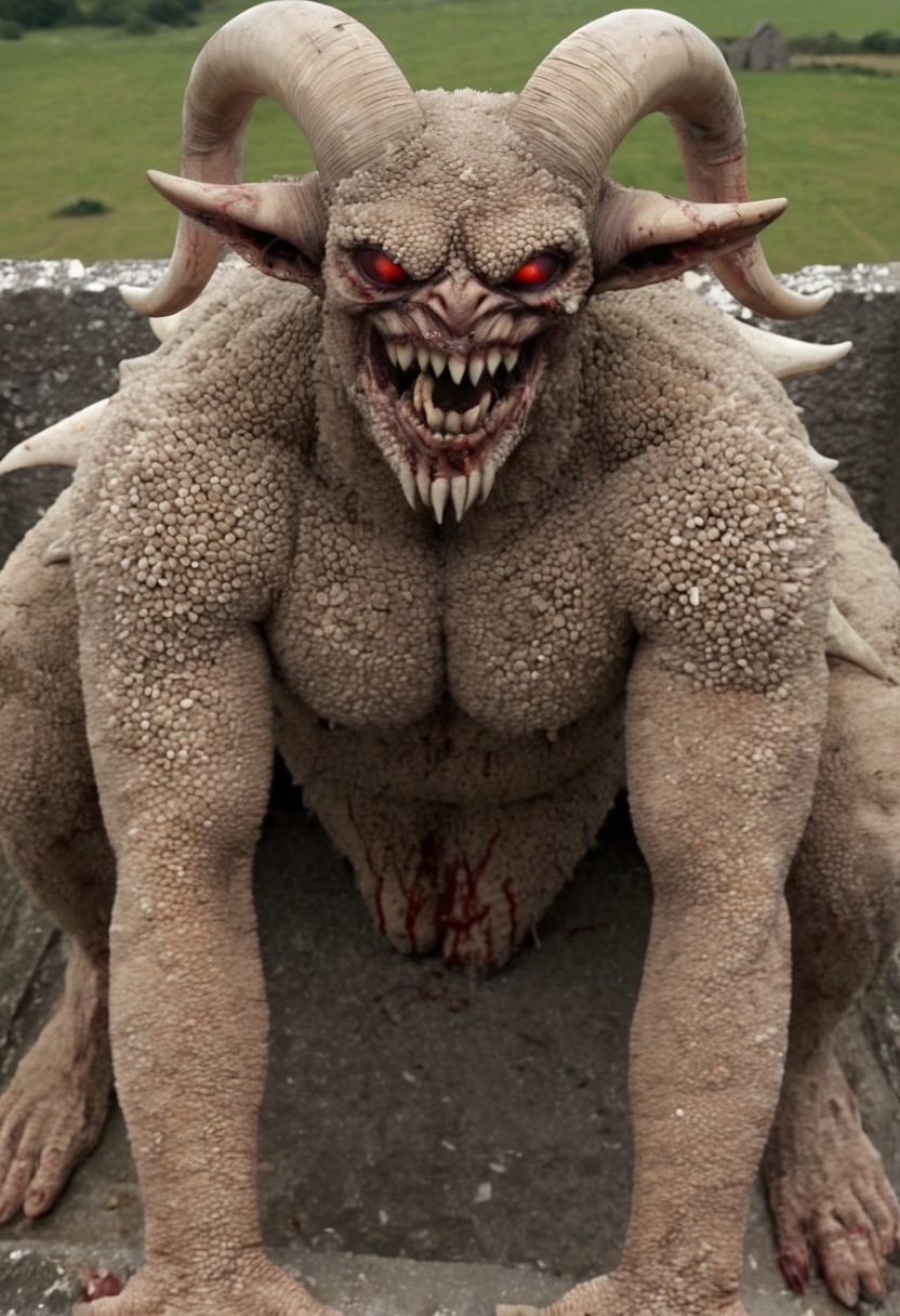 made_from_teef, winged demon with 4 arms, grotesque appearance, ram horns and blood red eyes, his skin is made with white teeth, he has 2 enormous fangs, perched on the dome of a church in a ruined town