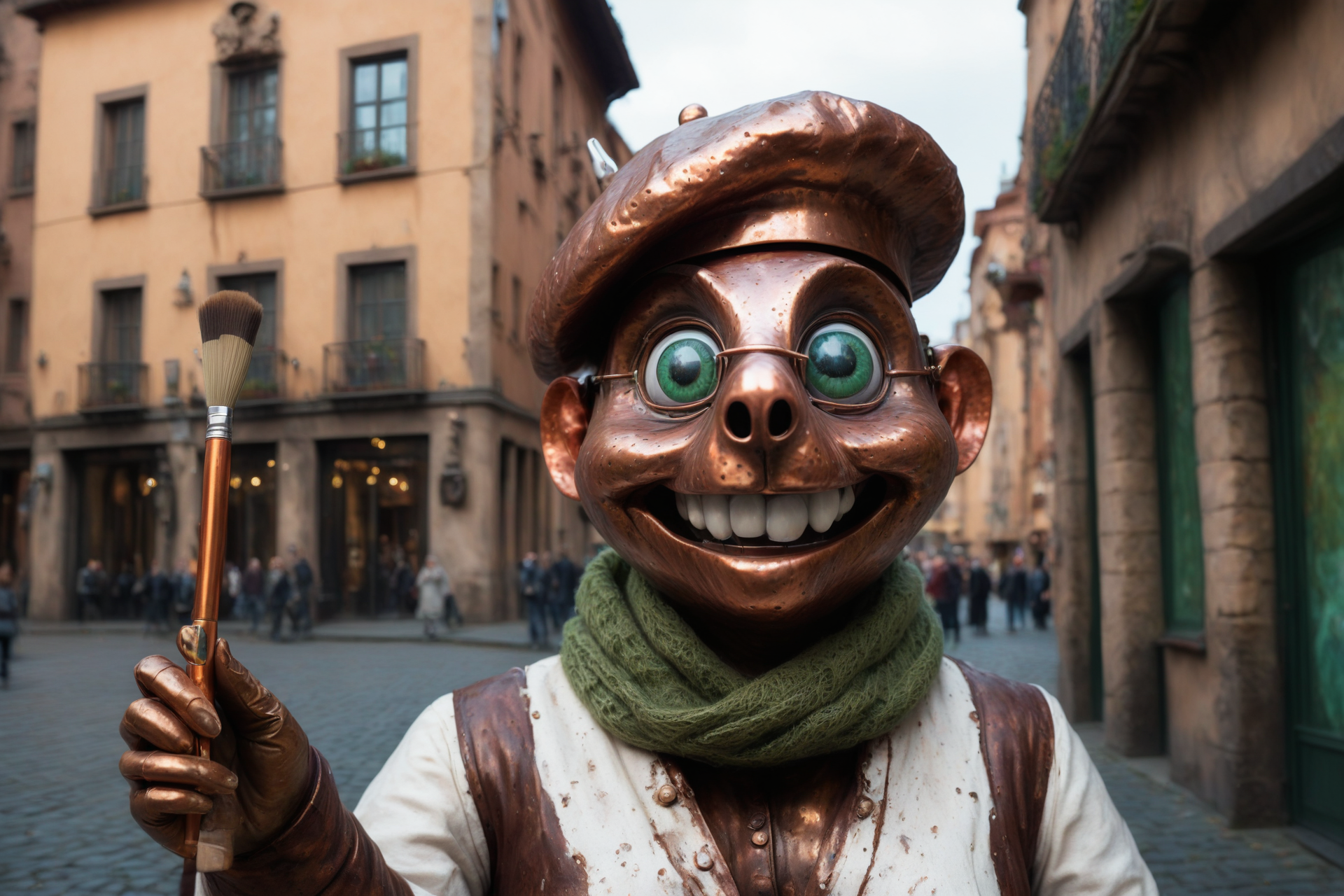 ((a copper rabbit artist with big round eyes, wearing a beret and scarf, holding a paintbrush, solo):2.5), ((toothy smile, eyes crinkled with joy, ears perked up):2.0), ((a charming town square with a fountain, cobblestone paths, people walking, a copper clock tower in the background, detailed background):2.2), ((checking a flight map, goggles pushed up, looking confident, friendly expression, warm smile, eyes soft with kindness, environment focus, wide shot):1.9), ((a copper scepter, ornate design, gem on top):1.5), ((best quality, vibrant colors, 3D render style, sharp contrast, natural earth tones, warm browns and greens, bright light):1.8), <lora:MadeOfCopper01_CE_SDXL:1>