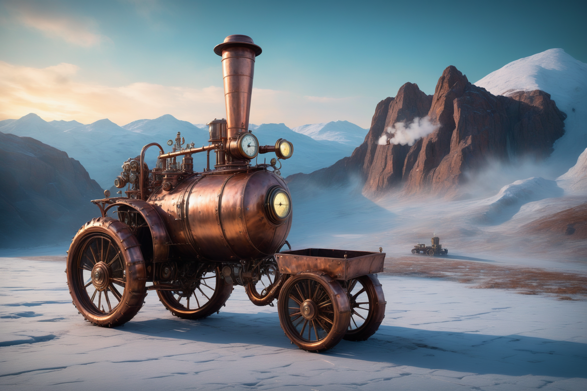 a copper steampunk tractor with steam plow, brass treads, solo, a copper balloon basket, brass railing, on a balloon, Ice Age tundra, frozen ground, mammoths, snow, a copper steampunk stopwatch, detailed background, traveling, steam billowing, gears turning, object focus, close-up shot, best quality, vibrant colors, photorealistic style, pulsing glow, soft pastel tones, muted blues and yellows, bright light, dynamic angle, wide shot, <lora:MadeOfCopper01_CE_SDXL:1>