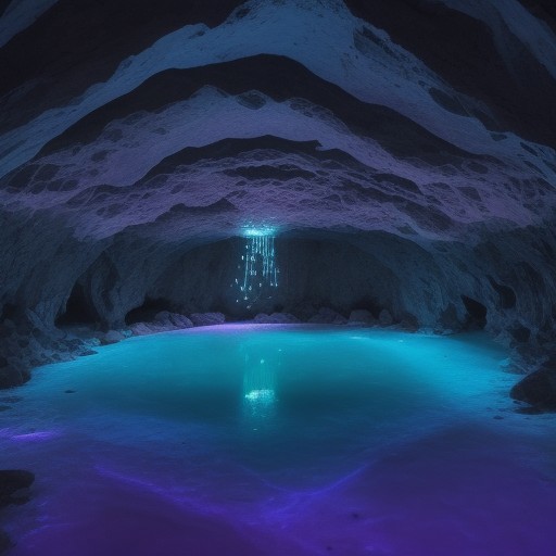 A breathtaking underground cavern filled with massive, glowing crystals in shades of blue, purple, and pink. A pool of clear water reflects the shimmering lights.