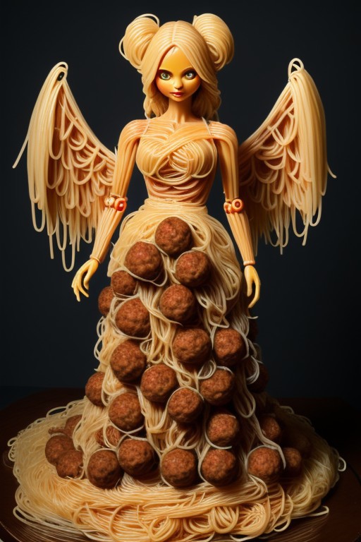 woodfigurez, closeup shot, full body, masterpiece made of spaghetti,amazing spaghetti android female with smooth varnished surface, glowing eyes, robotic wings, looking at viewer, detailed surface carving (painted with varnish colors:1.2), artistic style <lora:ral-woodfigurez:1>,sp4gh3tt1_dr3ss, dress made of spaghetti pasta and meatballs, portrait, close-up