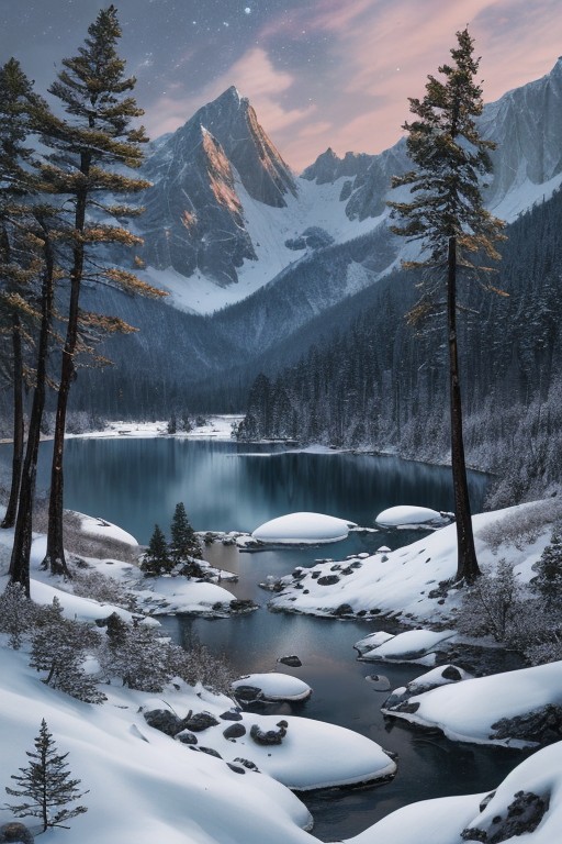 Masterpiece, high-resolution, grainy image, tall mountains, pine forest, lake, snow, galaxy, mountain trail