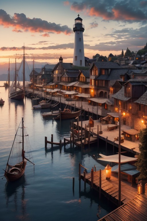 realistic analog photo, award winning photo, hado, vary wide shot of fortified harbor, Concrete lighthouse, docks, water, dusk, scenery, outdoors, RAW, highres, 8k, uhd, High Dynamic Range, tonemapping, crisp details,