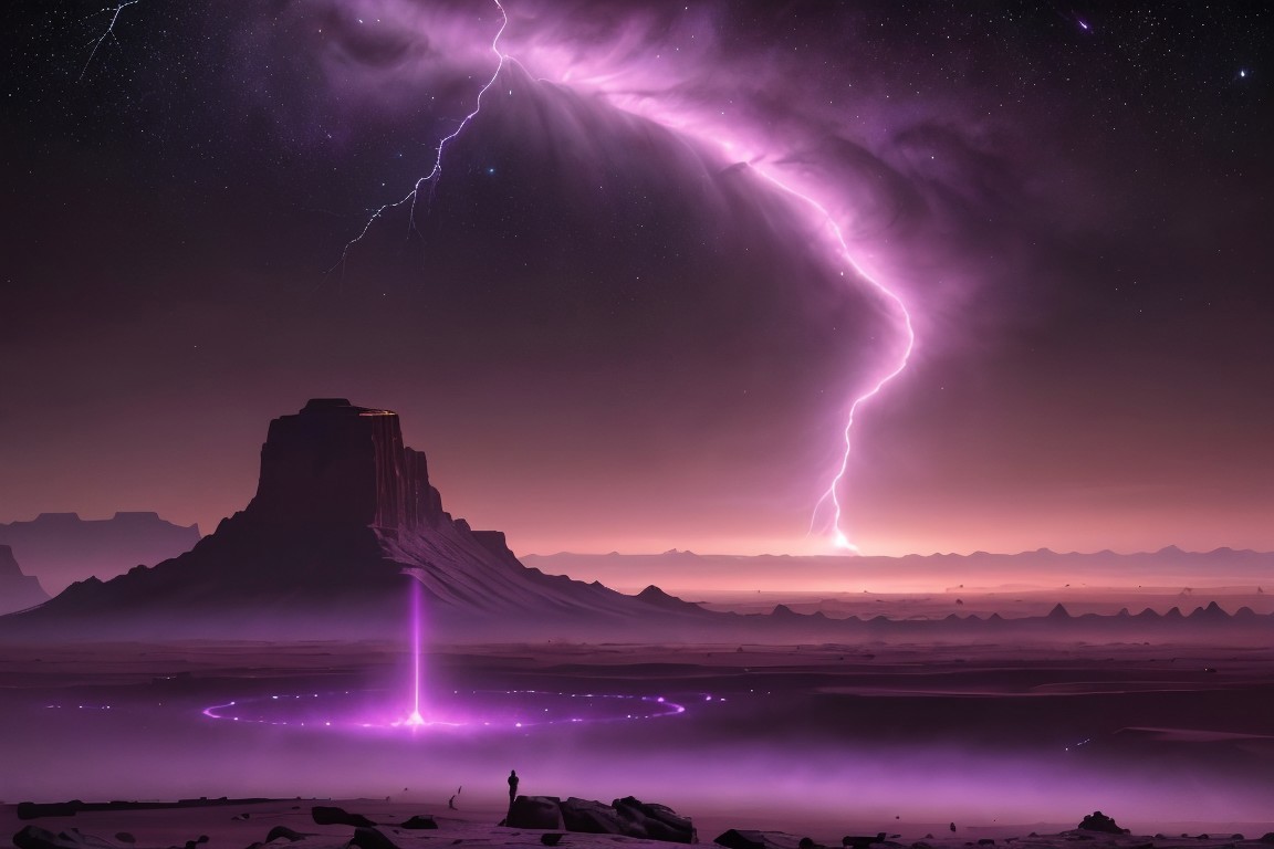 a massive futuristic city on an alien desert planet, viewed from a high mountain plateau at night, glowing neon hovercraft and spaceships navigating through swirling clouds of thick planetary dust, a colossal energy beam firing from the city's core into deep space, the city surrounded by a towering advanced wall, alien desert terrain with cracked earth and dunes, sephora-toned atmosphere (purple, mauve, soft pinks), violent solar storm above, arcs of space lightning crackling through the charged air, small spacecraft struggling to fly through the electric storm, atmospheric haze, distant alien cities visible on the horizon with glowing lights, in the sky: a massive celestial body looms, feeding off the glowing gases of a nearby nebula, tendrils of cosmic energy stretching between them, surreal space sky filled with stars and interstellar dust, hyper-detailed, cinematic sci-fi concept art, illustrated by Raphael Lacoste and Syd Mead