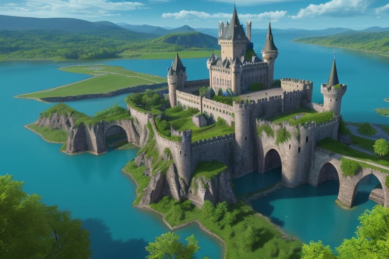 fantasy scenery, high view, large lake, island with majestic castle, dock,