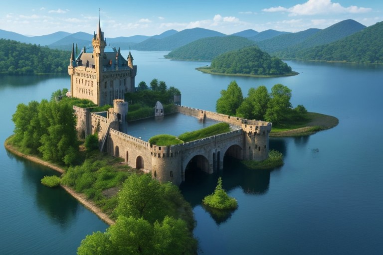 fantasy scenery, high view, large lake, island with majestic castle, dock,
