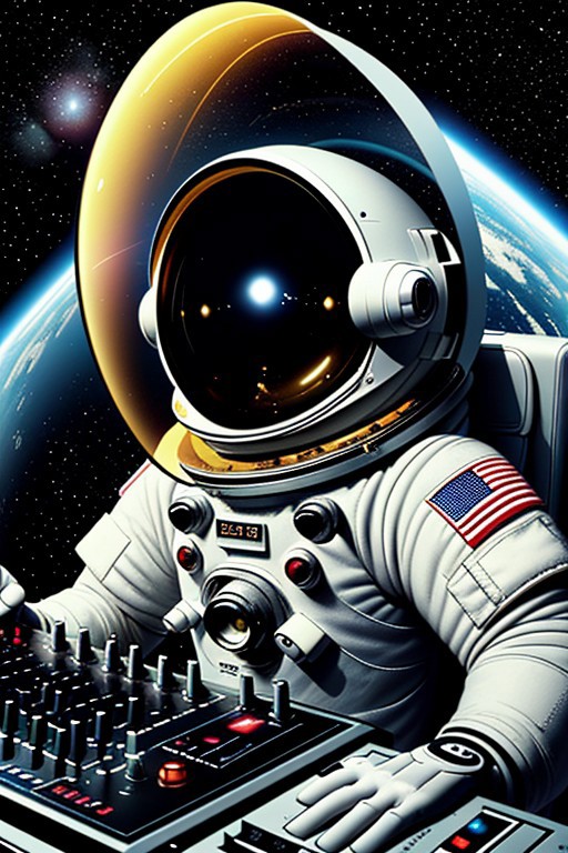 This is a stylized black and white illustration of an astronaut in space. The astronaut is wearing a spacesuit with a helmet, which has reflective visors showing the stars. The suit includes intricate details such as gloves, communication devices on the shoulders, and a camera attached to the chest. In front of the astronaut are two DJ turntables and a mixer. The astronaut's hands appear to be operating the equipment, suggesting that they are engaged in some form of music mixing or DJing. This creates a unique blend of space exploration and musical creativity within the same visual theme. The background features a starry sky, enhancing the cosmic atmosphere. The overall design combines elements from science fiction and modern culture, creating an imaginative scene where the boundaries between different realms are creatively merged.