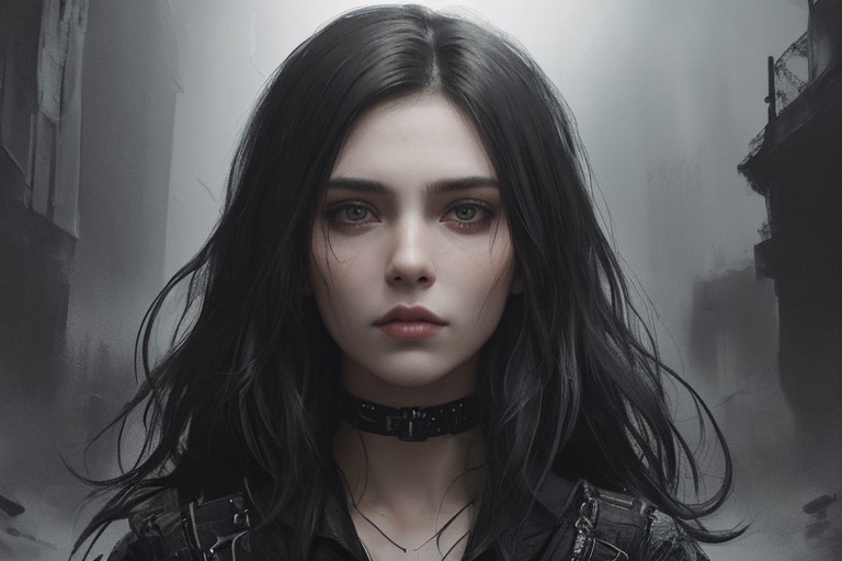 front-facing, looking into the camera muted color line art illustration, capturing a futuristic, dystopian aesthetic::female character with dark hair with text that reads "profandub", embodying an introspective and moody look::scene has dark, moody tones::dark and dreamlike background