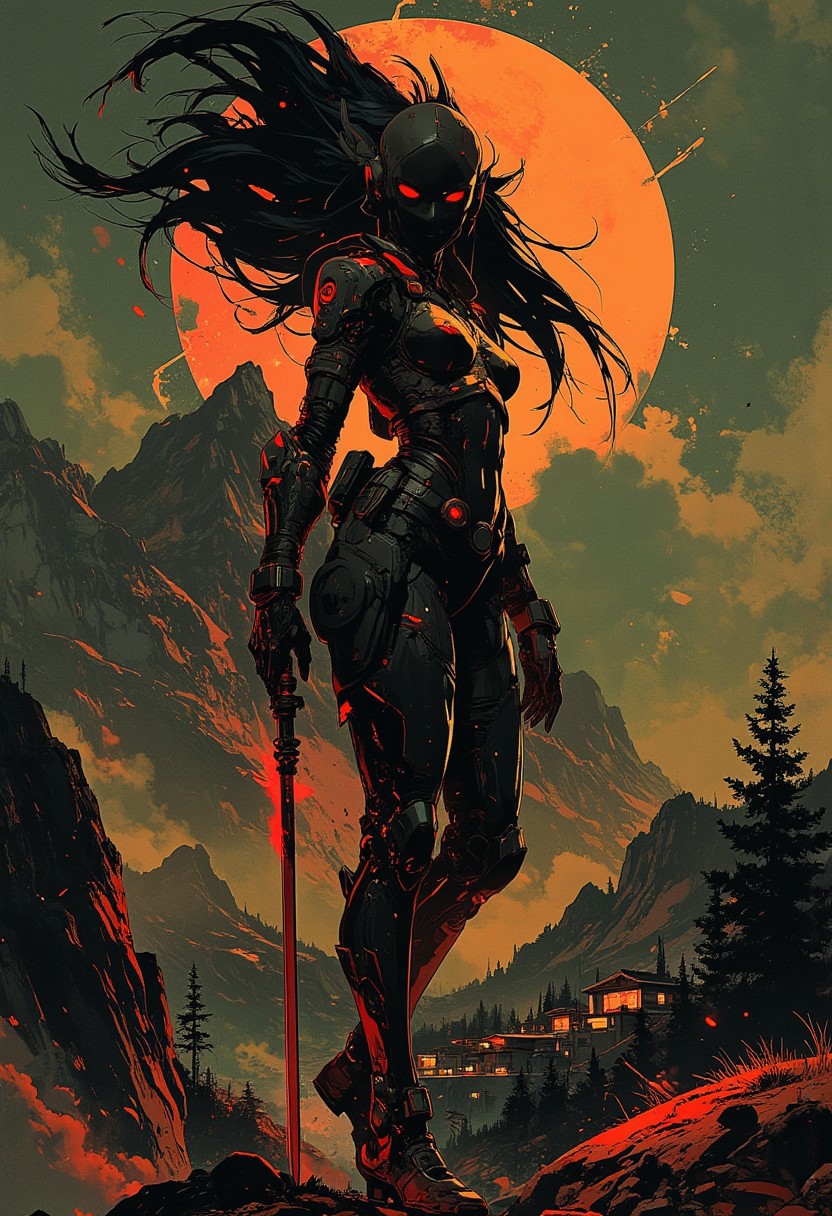 in the style of ck-mgs, nistyle, Inkplash art on rice paper, sepia, henna, Silhouette Art, magnificent, inksplash, closeup portrait, female spartan warrior, flowing black hair, reflective black and neon red armor, futuristic armor, holding a futuristic spear, abstract background suggesting a mountain top, overlooking a village in a valley, midnight atmosphere, moonlight, moon rays, night, Cowboy Shot, close up,
