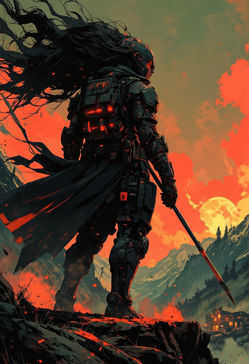 in the style of ck-mgs, nistyle, Inkplash art on rice paper, sepia, henna, Silhouette Art, magnificent, inksplash, closeup portrait, female spartan warrior, flowing black hair, reflective black and neon red armor, futuristic armor, holding a futuristic spear, abstract background suggesting a mountain top, overlooking a village in a valley, midnight atmosphere, moonlight, moon rays, night, Cowboy Shot, close up,