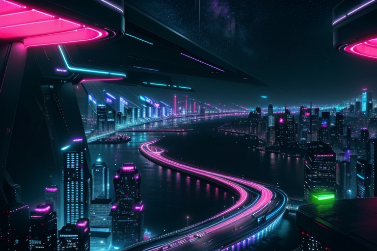 "A breathtaking cyberpunk cityscape at night, viewed from a high mountain road overlooking a sprawling futuristic city by the water. Two towering neon-lit mega-structures stand on opposite cliffs, glowing with vibrant lights in shades of white, yellow, purple, blue, orange, pink, green, and red. The city below is dense with skyscrapers and illuminated roads reflecting on the water, glowing with electric lights. A glowing arc of light or stars spans the night sky. The futuristic road, bordered by neon strips, and lined with small futuristic lamps. The scene blends nature and high-tech architecture, with lush vegetation on the cliffs. The atmosphere is cinematic, dramatic, vibrant, moody, high detail, photorealistic with a painterly touch, Blade Runner aesthetic, Tron aesthetic, ultra-detailed, 8k, epic scale."