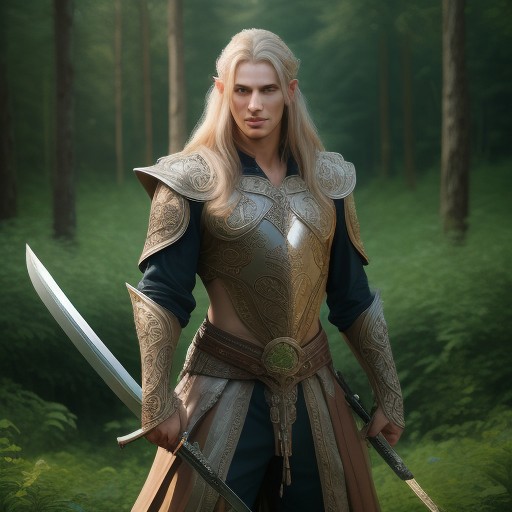 score_9, score_8_up, score_7_up, masterpiece, best quality, good quality, highly detailed, absurdres, intricate details, detailed eyes, detailed background, Expressiveh, high quality, highly detailed, highres, detailed, very aesthetic, solo male, DonM3lv3s, perfection style, elven warrior standing holding two long swords, ornate elven armor, green forest background