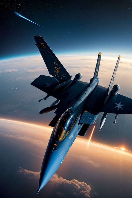 In the shape and style of a yfg-dr0p water drop splash photo of a , A fleet of advanced sci-fi fighter jets soaring through Earth's upper atmosphere, flying in perfect formation. The lead star fighter has a sleek, aerodynamic design with a metallic blue hull, equipped with glowing orange thrusters and high-tech weaponry, including missile launchers and energy cannons. The cockpit is enclosed by a transparent, futuristic glass canopy, reflecting the ambient light from space. The background features a breathtaking view of Earthâs curvature, with scattered clouds below and faint city lights glowing in the distance. The scene is illuminated by a deep blue cosmic glow, with distant stars visible in the background. The afterburners leave behind trails of bright white exhaust as the squadron moves in synchronized precision. The lighting is cinematic, with detailed reflections on the metallic surfaces of the spacecraft. The design is inspired by a fusion of futuristic military aesthetics, cyberpunk sci-fi, and space combat simulations.