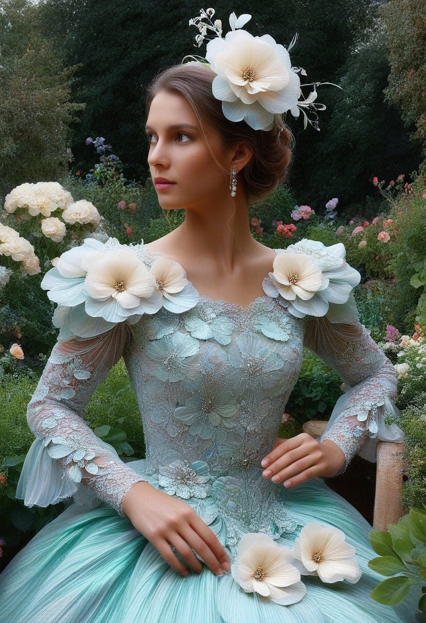 Masterpiece High Details, HD, highsafe content, woman, long dress made out of iridescent flower petals, sleeves, white jewelry, floral headdresses, garden on background, p1nk1r1fl0wers