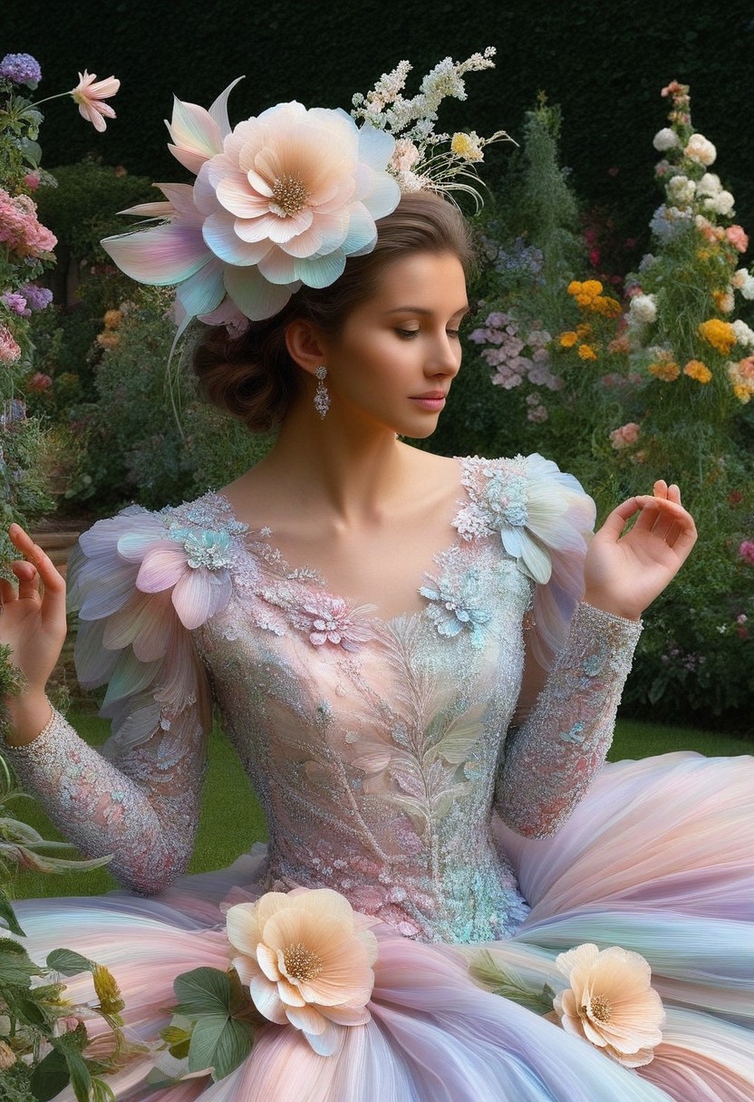 Masterpiece High Details, HD, highsafe content, woman, long dress made out of iridescent flower petals, sleeves, white jewelry, floral headdresses, garden on background, p1nk1r1fl0wers