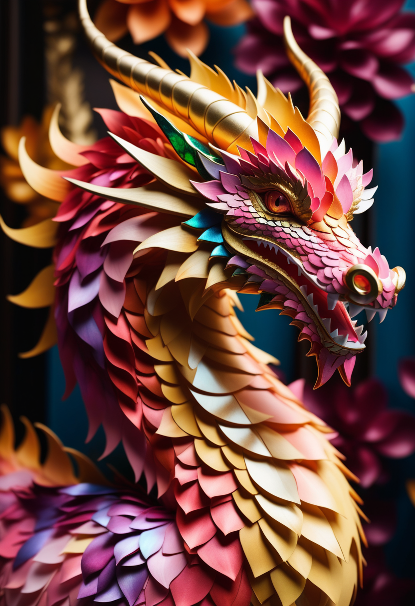 dragon made out of iridescent flower petals,<lora:PinkieIriFlwrsSDXL-000004:0.8>, p1nk1r1fl0wers, contemporary fine detail, luxurious, positive emotions, warm light, magnificent atmosphere, deep rich colors, beautifully detailed top quality colors, intricate, creative, <lora:aidmaImageUpgraderSDXL-v0.3:0.8> aidmaImageUpgrader