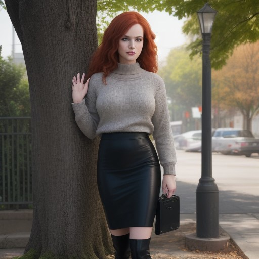 score_9, score_8_up, score_7_up, realistic lighting, photo, photorealistic, 1girl, an attractive 30-year-old woman standing next to a tree in the back yard. She is wearing a copper sweater blouse, copper and black checker skirt, black leggings, and black dress boots. She has long wavy red hair. She is carried a purse and a briefcase. She looks inviting to the camera. In the background is a neighborhood.